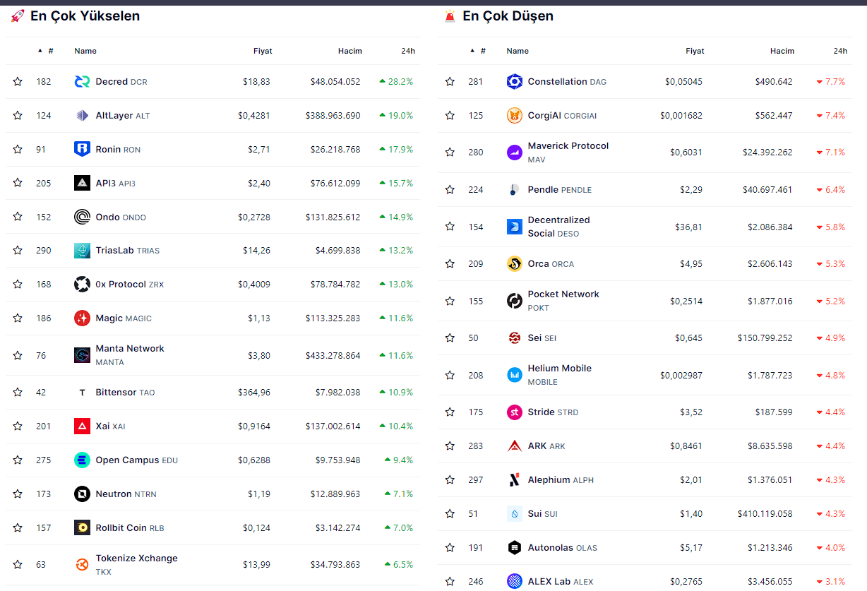 Hadi gelin bugün özelinde en çok artan ve düşen altcoin’lere birlikte göz atalım: