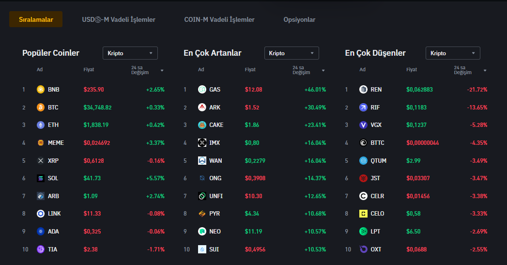 Hadi gelin dev kripto para borsası Binance’de listelenmiş altcoin’lerin son 24 saatteki performanslarla birlikte göz atalım: