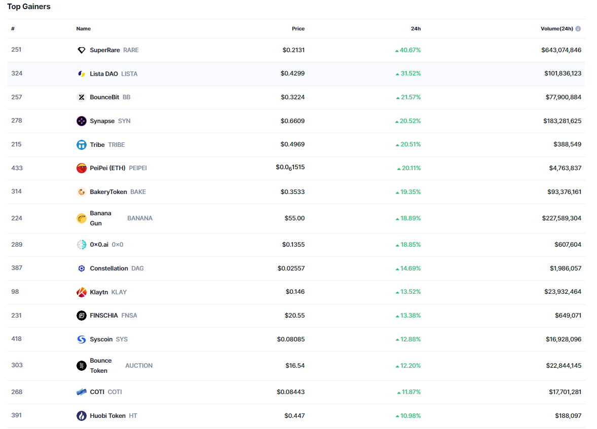 Başarılı veri sağlayıcısı CoinMarketCap’in aktardığı bilgilere göre son 24 saat özelinde ilk 500 kripto para birimi içerisinde en çok yükselişi %40 ile birlikte RARE isimli altcoin gerçekleştirdi.