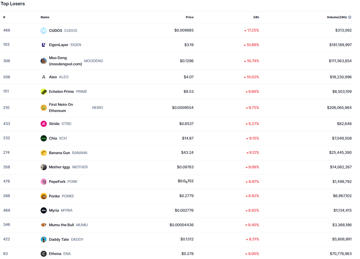 CUDOS’un yanı sıra EIGEN, MOODENG ve ALEO‘da %10’dan fazla değer kaybetti. Ayrıca PRIME, NEIRO, STRD, XCH ve BANANA‘da günün en çok düşen altcoin’leri arasında üst sıralarda yer aldı.