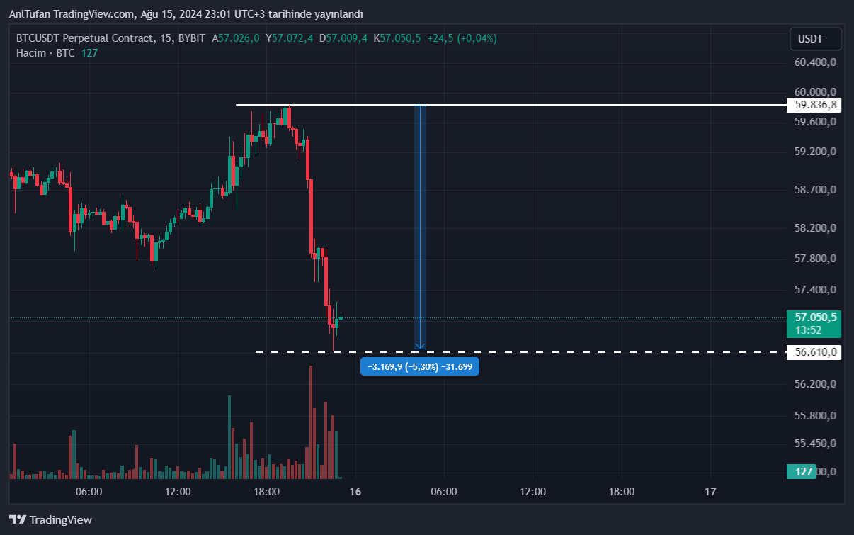 Kripto para sektöründeki kaotik süreç devam ediyor. Lider kripto para birimi Bitcoin (BTC) son 4 saat içerisinde %5’e yakın bir düşüş gerçekleştirerek 57 bin dolar seviyesine geriledi. BTC’deki son geri çekilmeler, tüm kripto varlıkları kötü etkilemiş durumda.