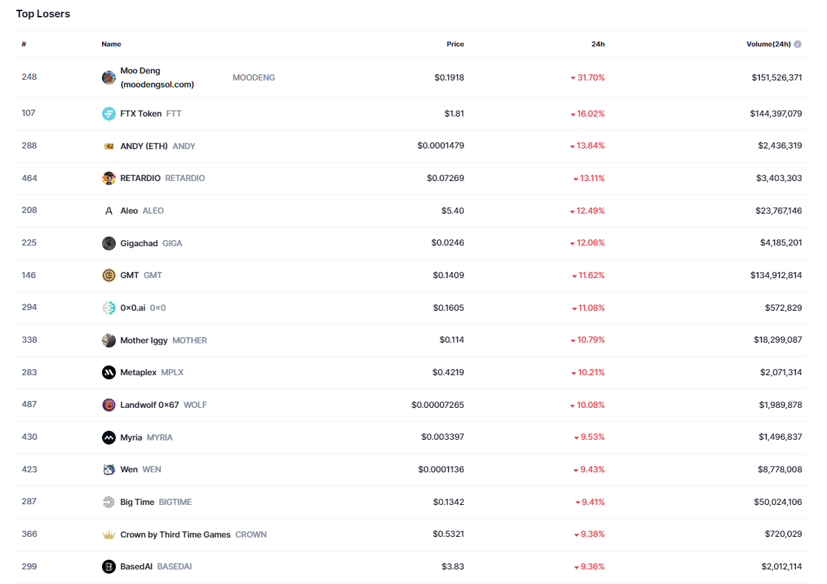 MOODENG’in yanı sıra FTT, ANDY, RETARDIO, ALEO, GIGA, GMT, 0x0 ve MOTHER‘da ciddi düşüşler gerçekleştirdi.