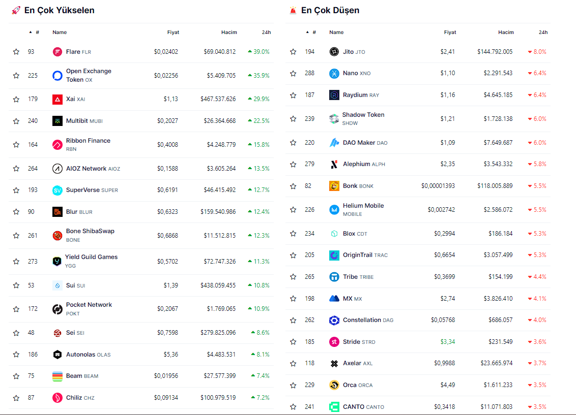 FLR haricinde OX, XAI, MUBI ve RBN de kayda değer yükselişler yaşadığı görüldü. Bu altcoin’ler son 24 saat içerisinde %15’den fazla değer kazanmayı başardı.
