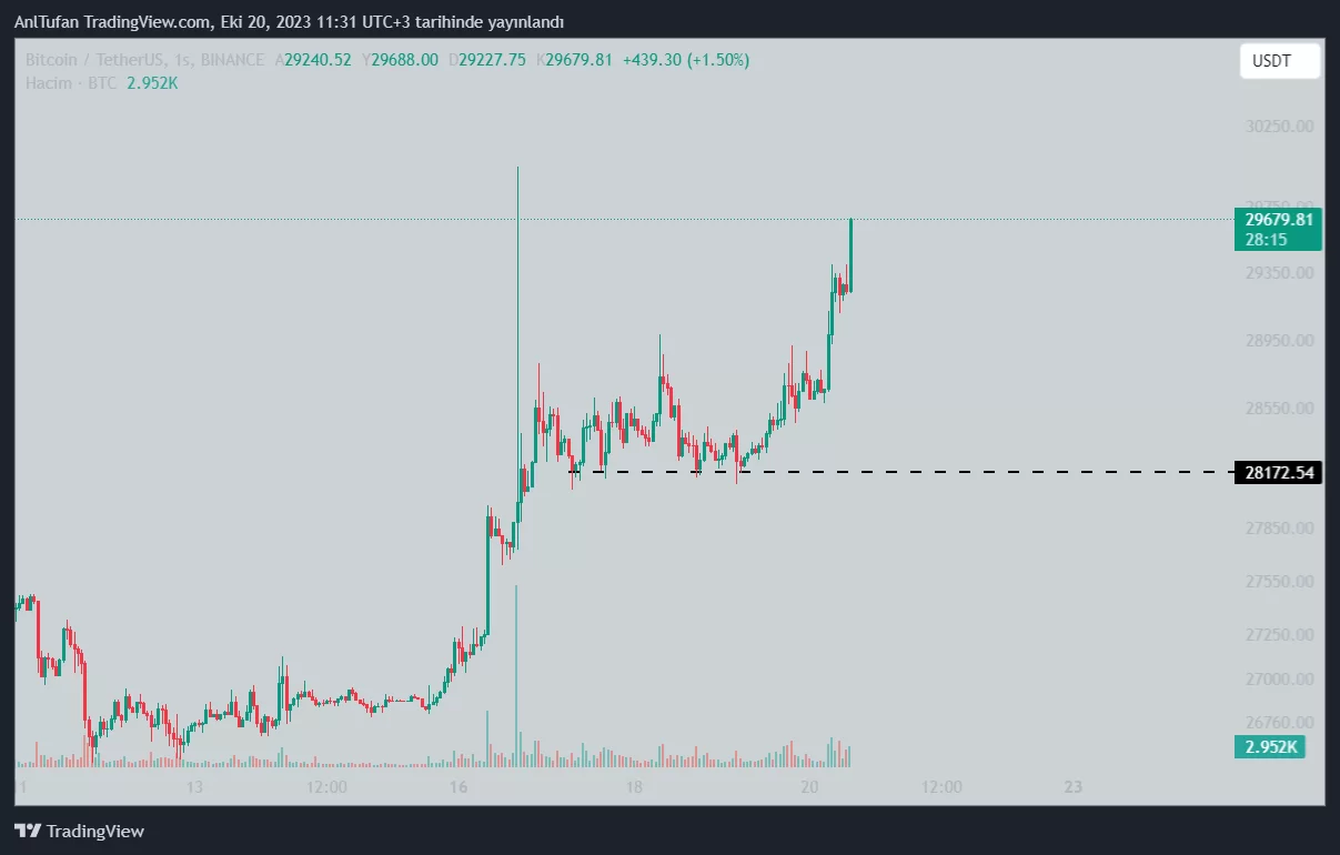 Şuan itibariyle Bitcoin kritik direnç seviyesi olan 30 bin dolara çok yaklaştı. Geçtiğimiz günlerde sahte ETF haberleri ile birlikte 30 bin dolara iğne atan BTC, sert bir düşüş yaşamıştı.