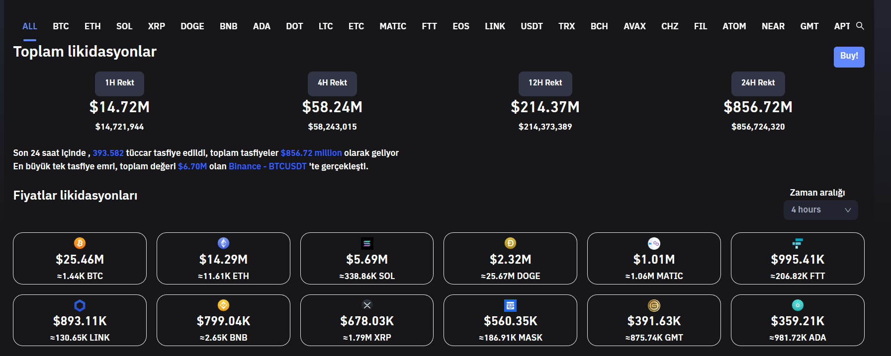 Başarılı bir veri sağlayıcısı olan CoinGlass’ın aktardıklarına göre, son 24 saat içerisinde 856 milyon dolarlık bir likidasyon operasyonu gerçekleştirildi.