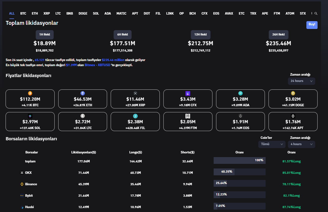 Bugün özelinde kripto sektöründeki toplam likidasyon seviyelerine baktığımızda ise 235 milyon dolar olduğu görülüyor. 68 bin adet yatırımcının likit olmasına sebebiyet veren kripto varlıklar, yatırımcılar üzerindeki korkunun tekrardan artmasına neden oldu.
