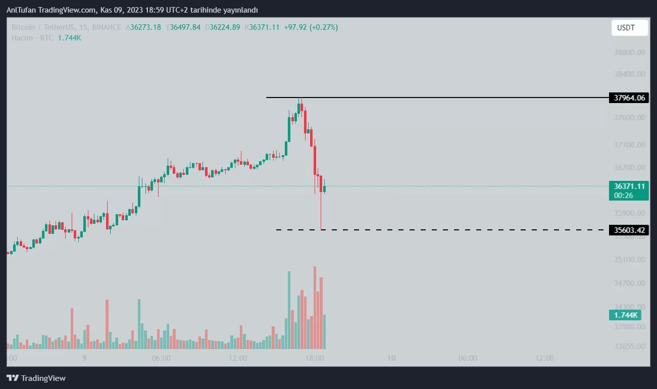 Çok kısa bir süre içerisinde 38 bin dolar seviyelerinden 35.600 dolara kadar yüzde 6’lık bir geri çekilme yaşayan BTC, altcoin‘leri de fazlasıyla kötü etkiledi.