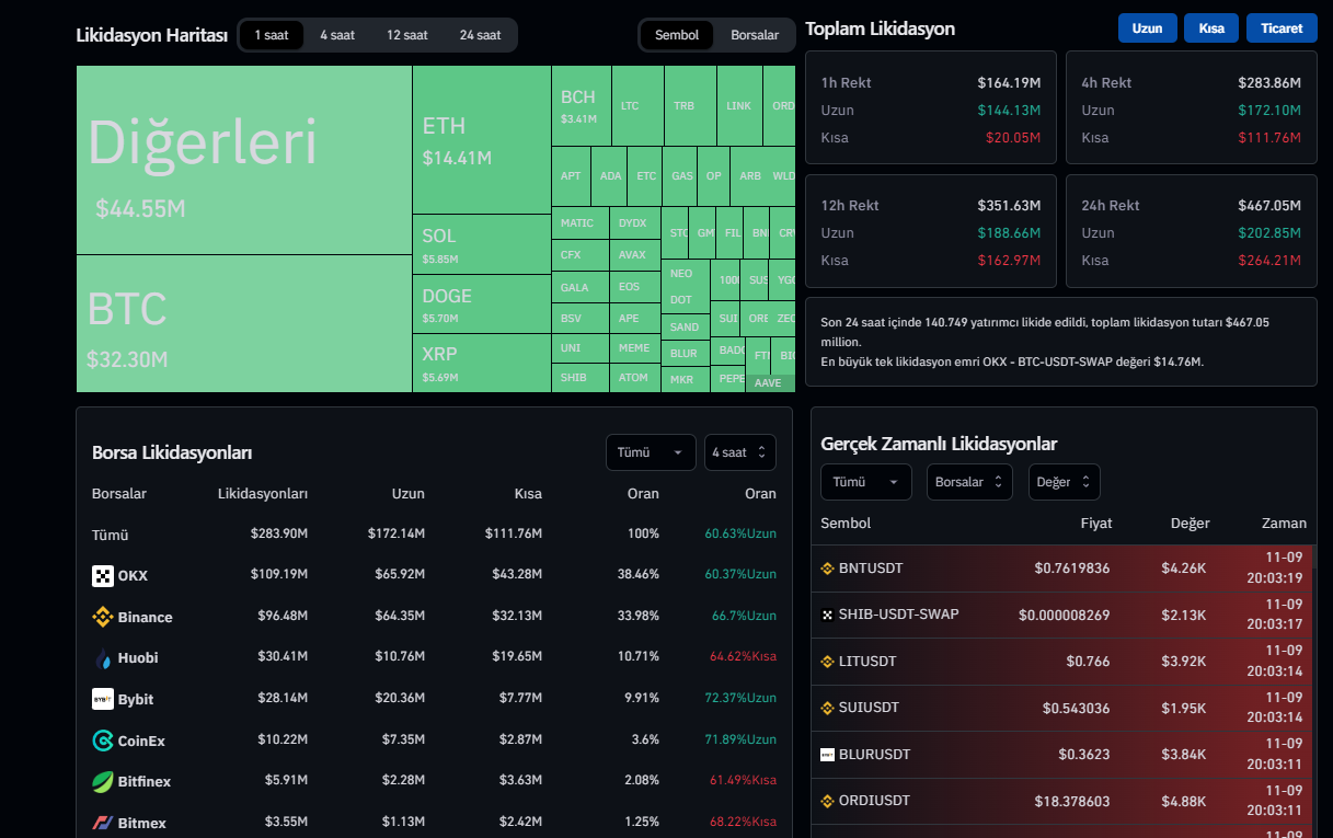Başarılı bir veri sağlayıcısı olan CoinGlass’ın son aktardıklarına göre Bitcoin ve altcoin’lerde son 24 saat içerisinde toplamda 467 milyon dolarlık pozisyon likit edildi.