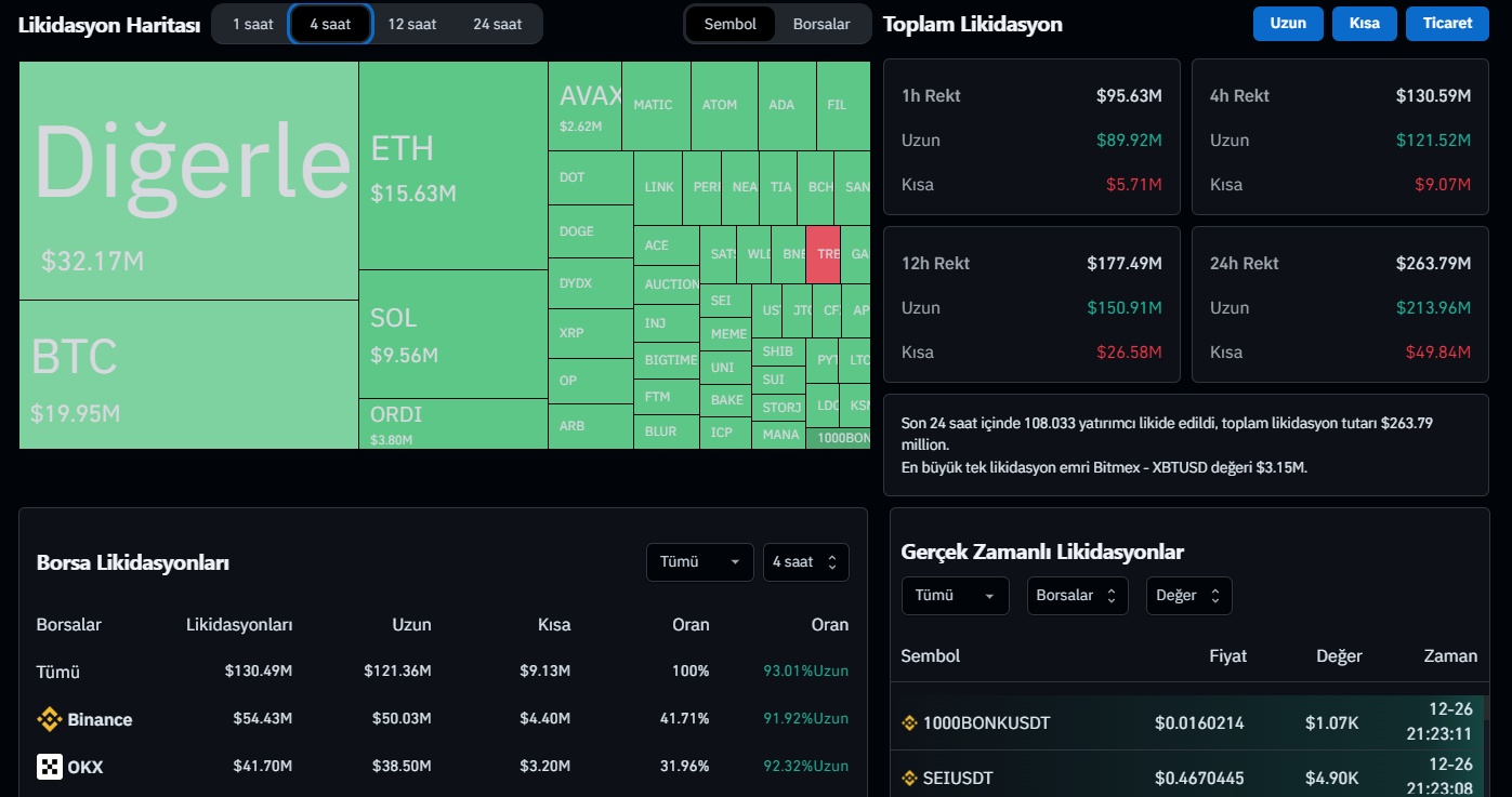 Son 24 saat içerisinde yaşanan ani düşüş ve yükselişler nedeniyle toplamda 108 bin yatırımcı likit edildi. En büyük tek likidasyon emrinin ise Bitmex‘te olduğu görülüyor (BTC – 3.15 milyon dolar).