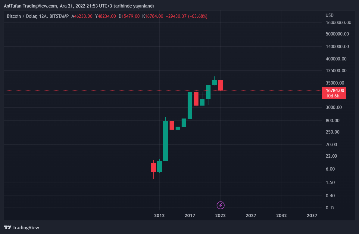2014 ve 2018 yılındaki ayı sezonlarında sert düşüşler yaşayarak sektördeki kırılgan yatırımcıların temizlenmesini sağlayan BTC, 2022 yılında da tarihsel döngüye uygun hareket ederek yine düşüş yaşadı.