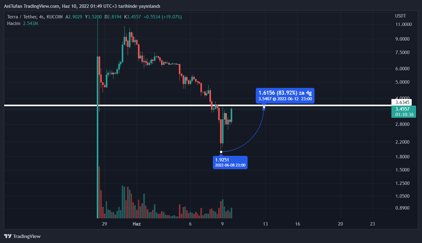 Bugün itibariyle %85’e yakın değer kazandığını gördüğümüz LUNA, ilerleyen saatlerde 3.63 dolar direncini aşmasıyla birlikte yükselişlerine devam edebilir.