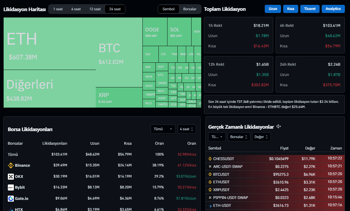 Bu likit edilen pozisyonların 1.9 milyar dolarlık kısmının ise long pozisyon olduğu görülüyor. Ortalama bir 300 milyon dolarlık short likidasyonu olsa da, bu likidasyonun büyük çoğunluğu da son dakikalarda ufak toparlanmada yaşandı.