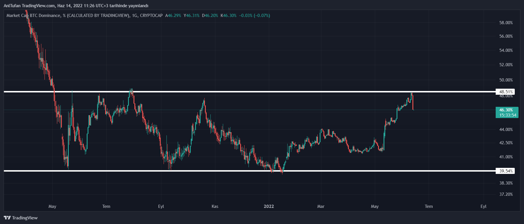 İlerleyen süreçte %48.51 seviyesini aşmadığı sürece altcoin yatırımcıları sektör için olumlu olabilecek olsa da, bu seviyenin aşılması kripto sektörünü yeniden bir kaosa sürükleyebilir gibi gözüküyor.
