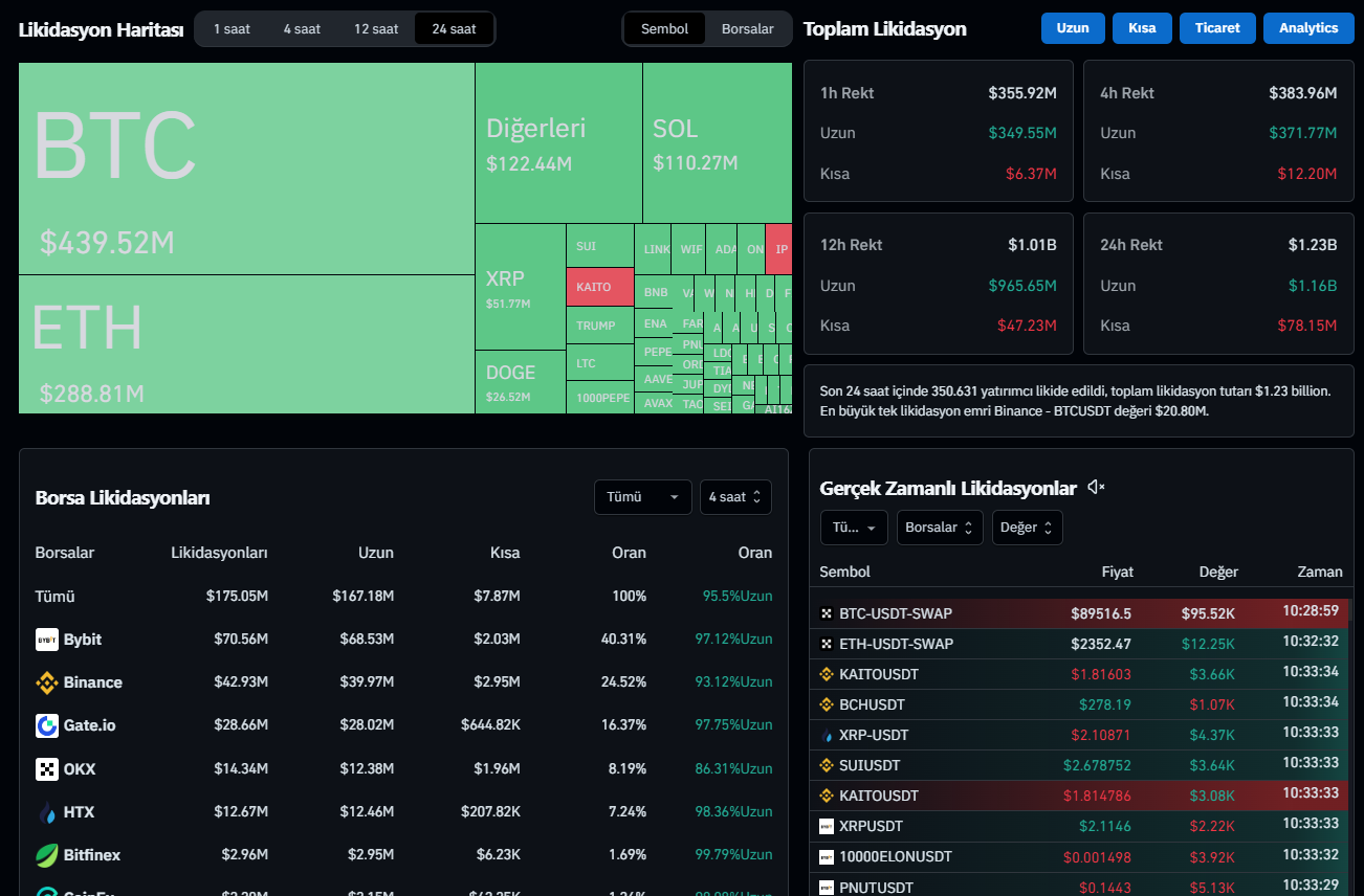 Başarılı bir veri şirketi olan CoinGlass’ın paylaştığı bilgilere göre son 24 saat içerisinde yaşanan düşüşler nedeniyle kripto piyasasında toplamda 1.23 milyar dolarlık pozisyon likit edildi.