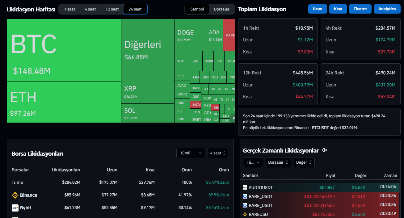 Sadece bugün özelinde yaşanan düşüşler nedeniyle 200 bin yatırımcı likit olmuş durumda. Son 24 saat içerisinde toplamda 437 milyon dolarlık long pozisyon likit edilirken, sadece 53 milyon dolarlık short pozisyonun likit edildiği görüldü.