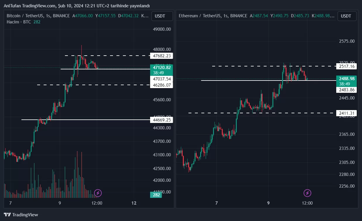 Hafta sonu itibariyle Bitcoin’in 47 bin dolar – 47.700 dolar aralığında akümüle olması beklenmekte. Aşağı yönlü bir kırılım 46.250 dolar ve 44.650 dolar desteklerine kadar düşüş getirebileceği gibi yukarı yönlü bir kırılım BTC’nin 49 bin dolara ulaşmasını sağlayabilir.