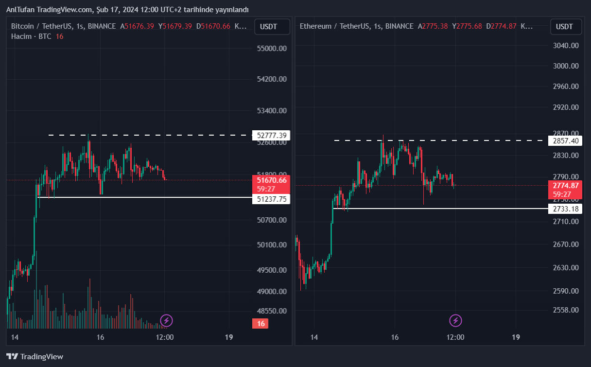 Bu hafta sonu özelinde de yatay trendin devam etmesi bekleniyor. Bir süredir 51.200 – 52.700 dolar aralığında akümüle olan BTC, bir süre daha bu aralıkta kalacaktır.