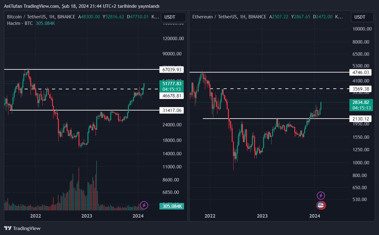 Kritik bir direnç noktası olan 46.650 doların aşılımı ile birlikte daha sert artışlar yaşamayı başaran BTC, bu gece haftalık kapanışını gerçekleştirecek. BTC’nin 50 bin doların üzerinde kaldığı sürece yükseliş trendine devam etmesi bekleniyor.