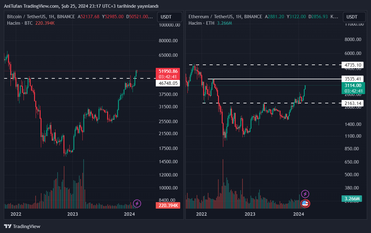 Haftalık kapanış öncesinde 51.850 dolardan işlem gören BTC, 50 bin dolar desteğini kaybetmediği sürece sert bir geri çekilme yaşamayacak gibi gözüküyor.