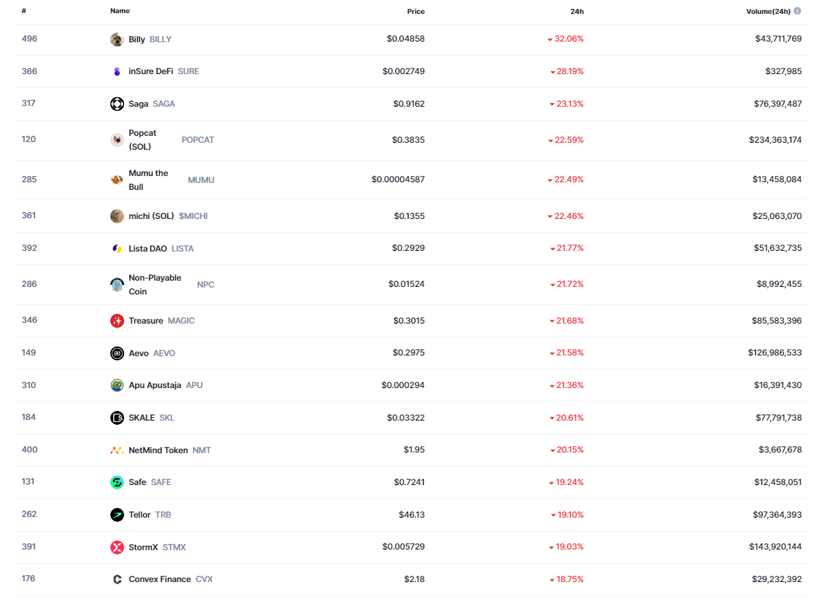 BILLY haricinde SURE, SAGA, POPCAT, MUMU, MICHI ve LISTA gibi altcoin’lerin de çok ciddi miktarda düşüş yaşadığı görüldü.