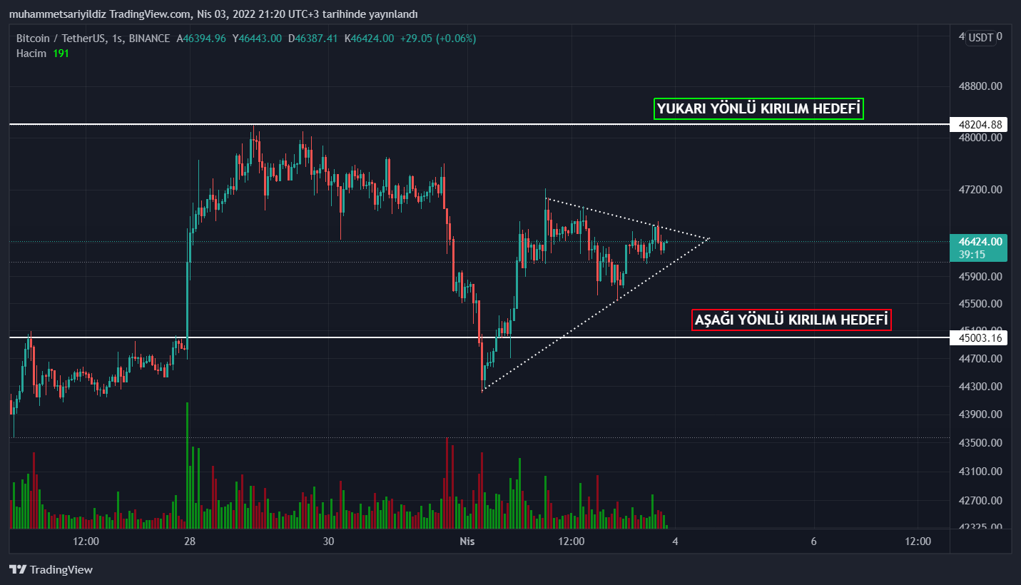 Haberimizin yazıldığı esna da 46.400 dolar seviyelerinde bulunan Bitcoin, kısa vadeli görünümde simetrik üçgen formasyonu oluşturmuş durumda.