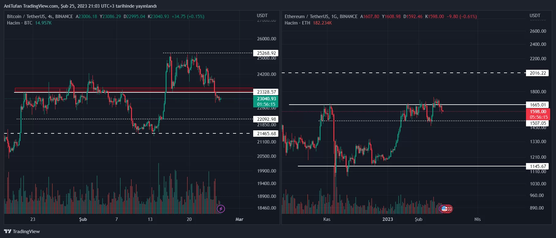 Bugün itibariyle kritik bir dirence dönüşen 23.300 doların altında akümüle olan Bitcoin, sert düşüşler yaşamamış olsa da, halen 23.300 doları geri kazanmayı başaramamış durumda.