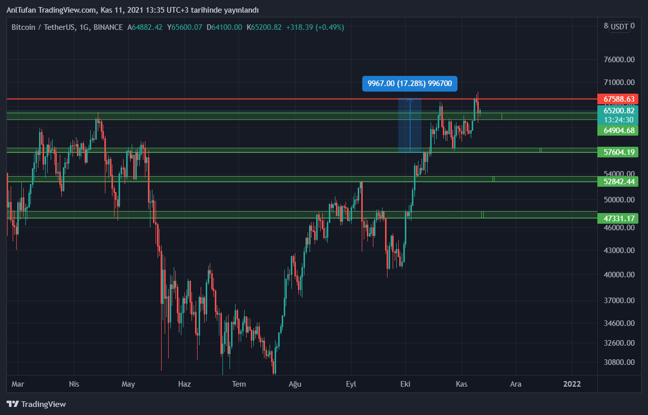 67.588 dolar seviyesinin önemli bir direnç olduğu Bitcoin’de bu seviyenin aşılıp üzerinde günlük kapanış yaptığı takdir de önce 70.000 dolar psikoloji direncine ardından ise 100.000 dolar seviyelerine kadar bir yükselişe başlaması bekleniyor.