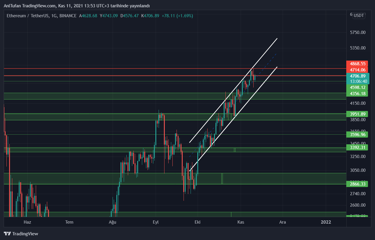 4868 dolar seviyelerinden reddedilen Ethereum çok güzel bir yükselen paralel kanal içinde hareket etmekte. Bu kanaldan çıkmadığı takdirde yatırımcılarını güzel kazançlar sağlayabilecek olan Ethereum’da dikkat çeken iki direnç seviyesi 4714 dolar ve 4868 dolar seviyeleri oluyor.