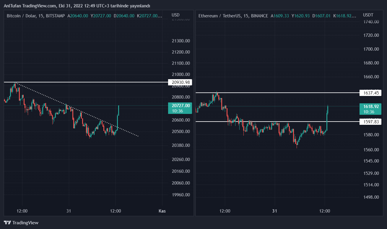 Kısa vadeli 15 dakikalık grafiklerimizde lider kripto para birimi Bitcoin ve lider altcoin Ethereum‘u incelediğimizde, kırılımların gerçekleştiği görülebiliyor.