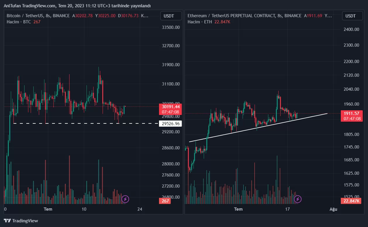 Bugün itibariyle Bitcoin ve ETH’nin yükselişe geçtiği görüldü. BTC yeniden 30.200 dolar seviyelerine ulaşırken, ETH ise 1.910 doları aşmayı başardı.