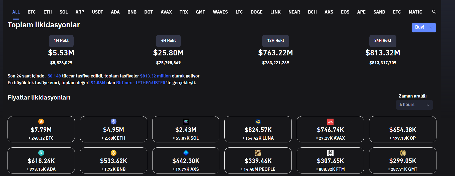 Tüm kripto piyasasına gelince ise, toplam likidasyon seviyesinin yaklaşık 809 milyon dolar seviyesinde bulunduğu görülmekte.