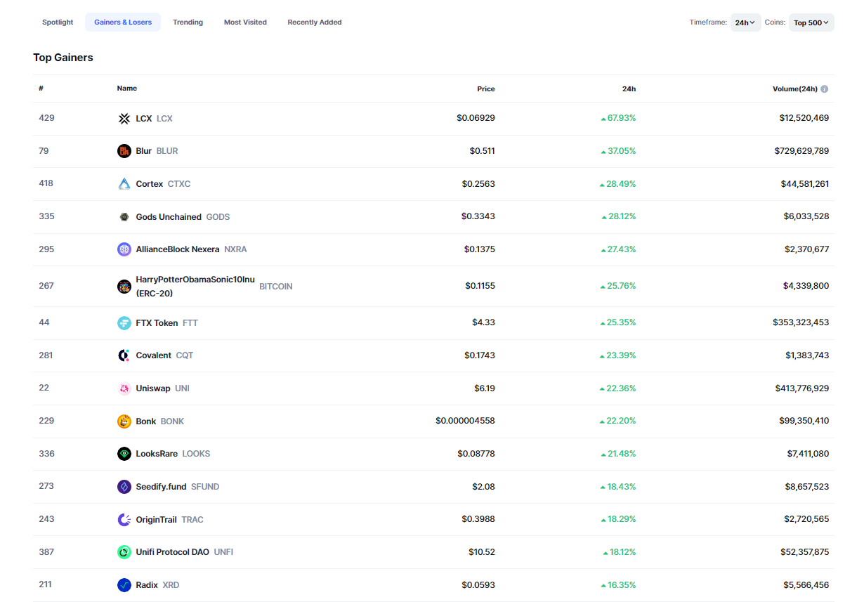 Başarılı bir veri sağlayıcısı olan CoinMarketCap’in paylaştığı bilgilere göre son 24 özelinde ilk 500 kripto para birimi içerisinde en büyük yükselişi LCX isimli altcoin gerçekleştirdi.