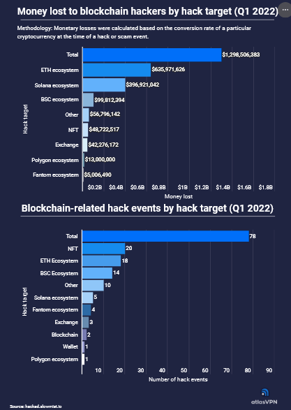 Atlas VPN ekibi tarafından yapılan araştırmaya göre blockchain korsanları ve bu sektörü hedef alan hackerlar 2022’nin ilk çeyreğinde 78 hack olayında yaklaşık 1,3 milyar dolar çalmayı başardı.