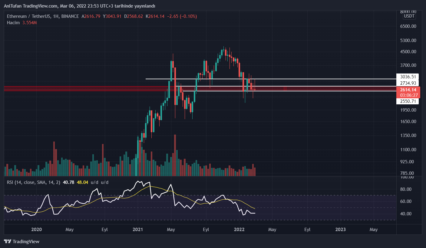 Kritik destek aralığı olan 2550 – 2700 dolar bölgesi içinde bulunan ETH, bir yükseliş trendine girebilmesi için 3000 doları kırması gerekiyor.