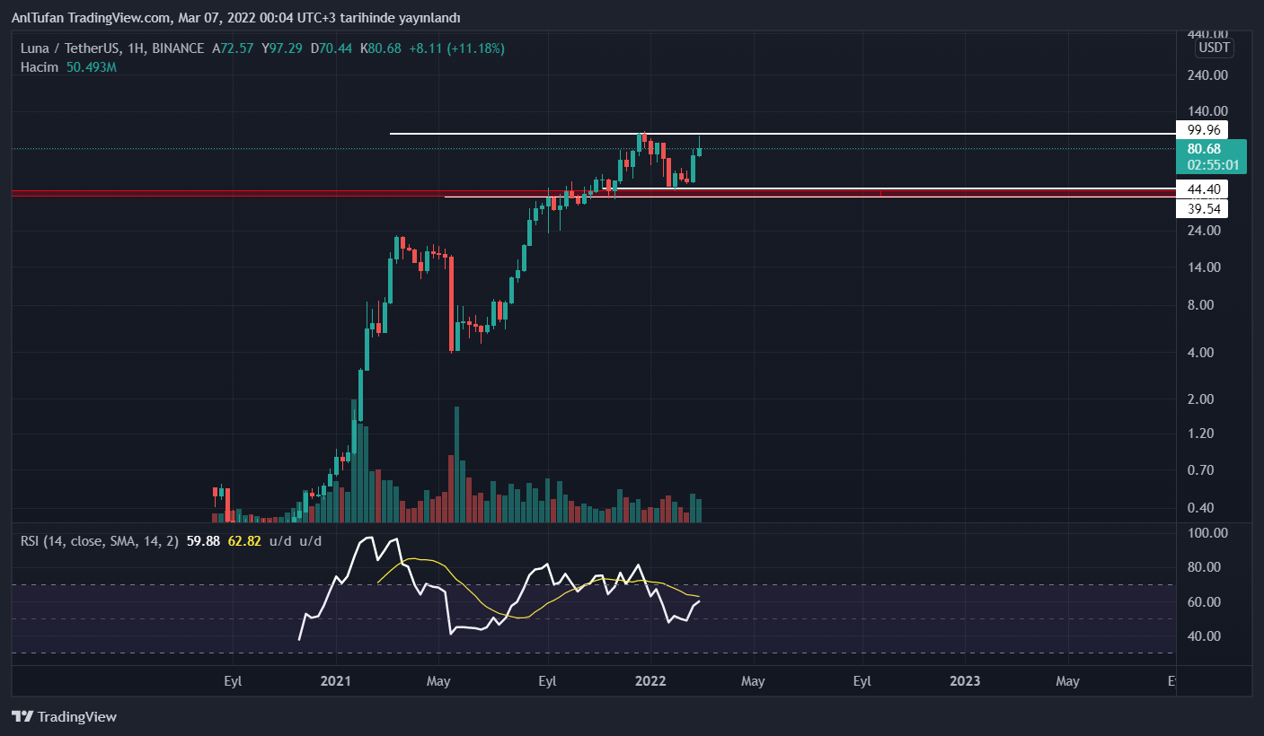 ATH seviyesi olan 100 doları aşması durumunda yükselişine devam edecek olan LUNA, bu direnci aşamaması halinde düşüş yaşayabilir.