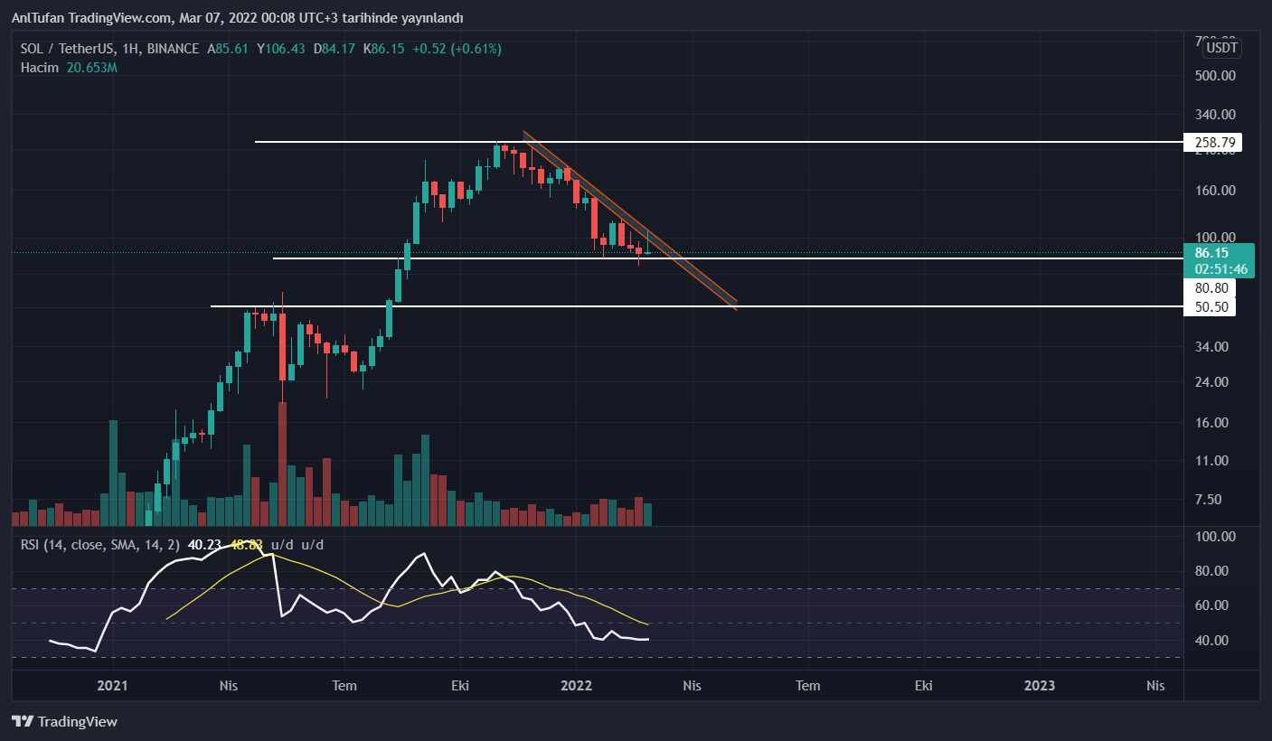 Bu destek seviyesini kaybetmesi halinde 50 dolar seviyelerine kadar bir düşüş yapabilecek olan SOL, düşen trendini kırmayı başarması halinde ise ATH seviyesi olan 250 dolar direncini deneyebilir.
