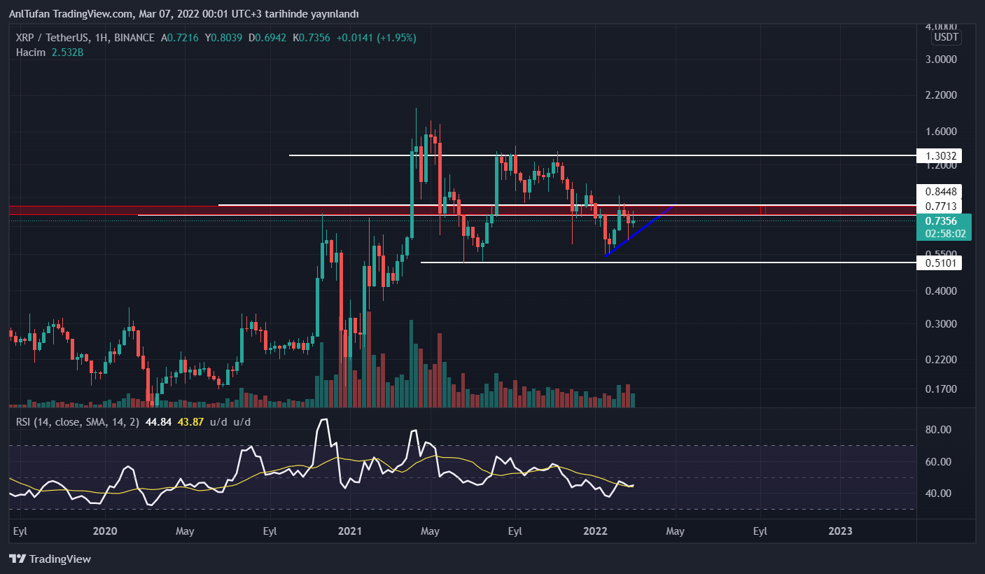 Güzel bir yükselen trend oluşturmuş olan XRP, 0.77 – 0.80 dolar direnç seviyesinin hemen altında konumlanıyor.