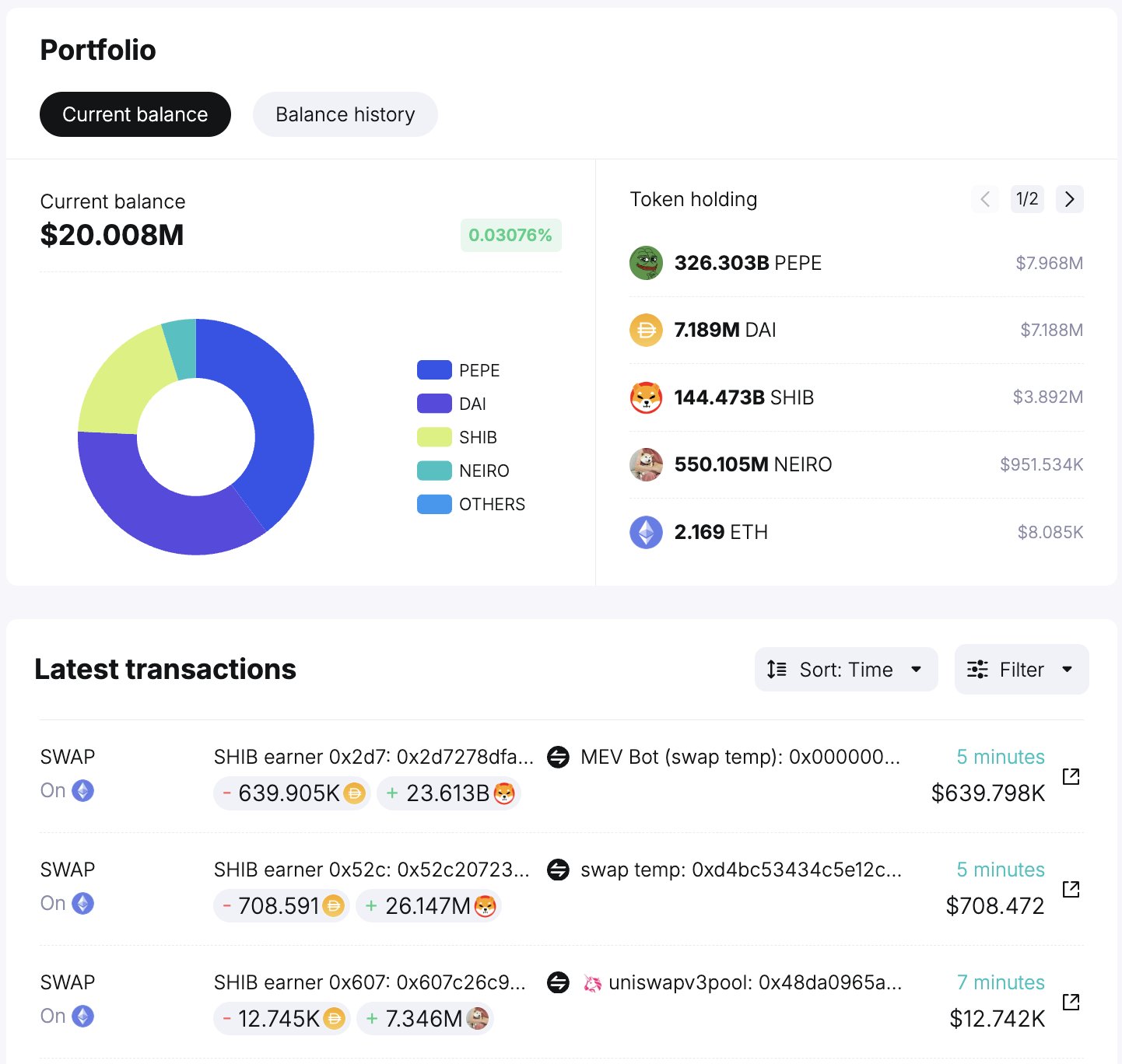 “Bu yılın başlarında SHIB ve WBTC’den 8,66 milyon dolar kazanan balina, şimdi PEPE, SHIB ve NEIRO satın alıyor.
