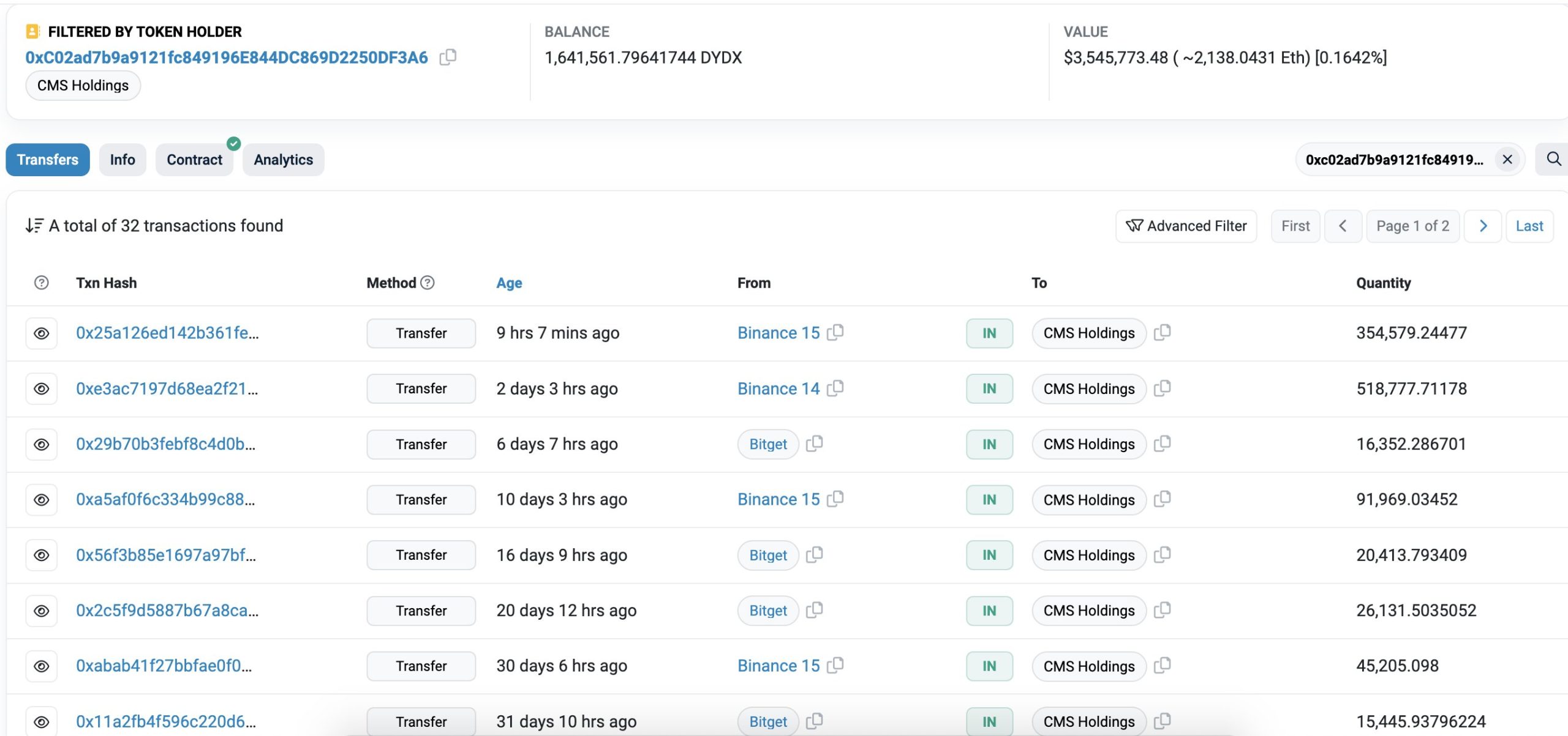 CMS Holdings, 21 Temmuz’dan bu yana bitget ve binance borsalarından toplamda 1,64 milyon adet DYDX (3,53 milyon dolar değerinde) çekimi gerçekleştirdi.”