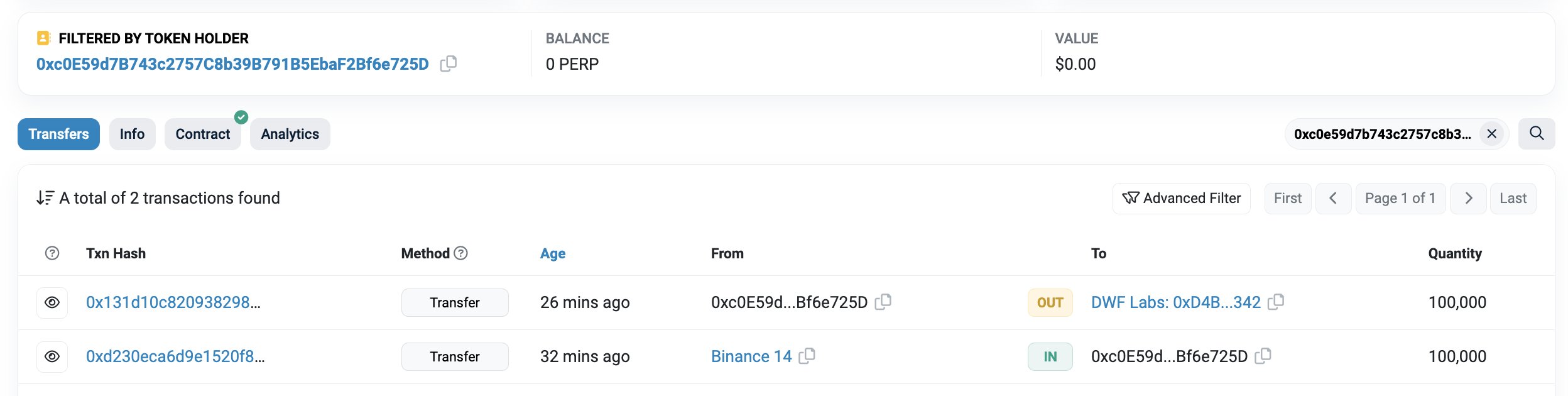 DWF Labs geçtiğimiz dakikalarda Binance borsasından kripto satın alımı gerçekleştirdi. Son dönemlerin popüler altcoin’i PERP‘e yatırım yapmayı tercih eden DWF Labs, yatırımcıların dikkatini çekti.