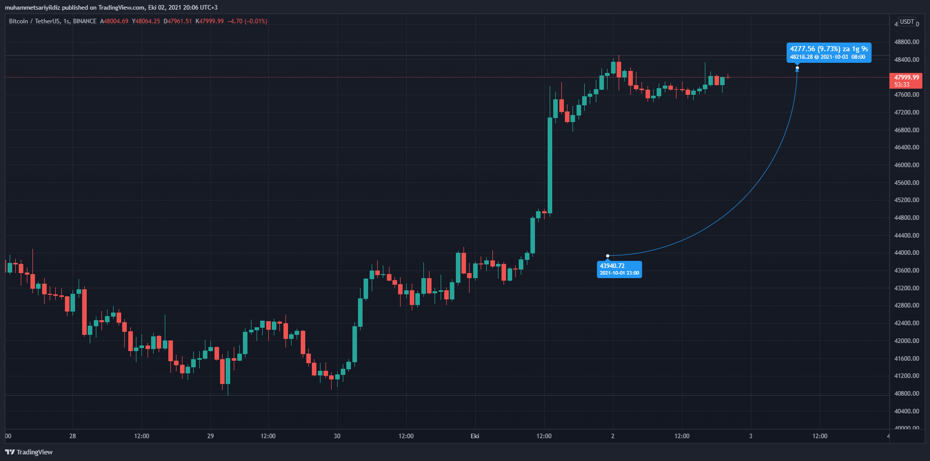 Bitcoin’in 1 saatlik grafikte bir anda 44.000 dolar bandından 48.000 dolar bandına doğru olan yükselişi sadece BTC için değil altcoinler için de yeni bir rallinin kapısını araladı. Yatırımcılar bir anda 48.000 dolara ulaşılmasından dolayı ise artık korkmuyor gibi gözüküyor.