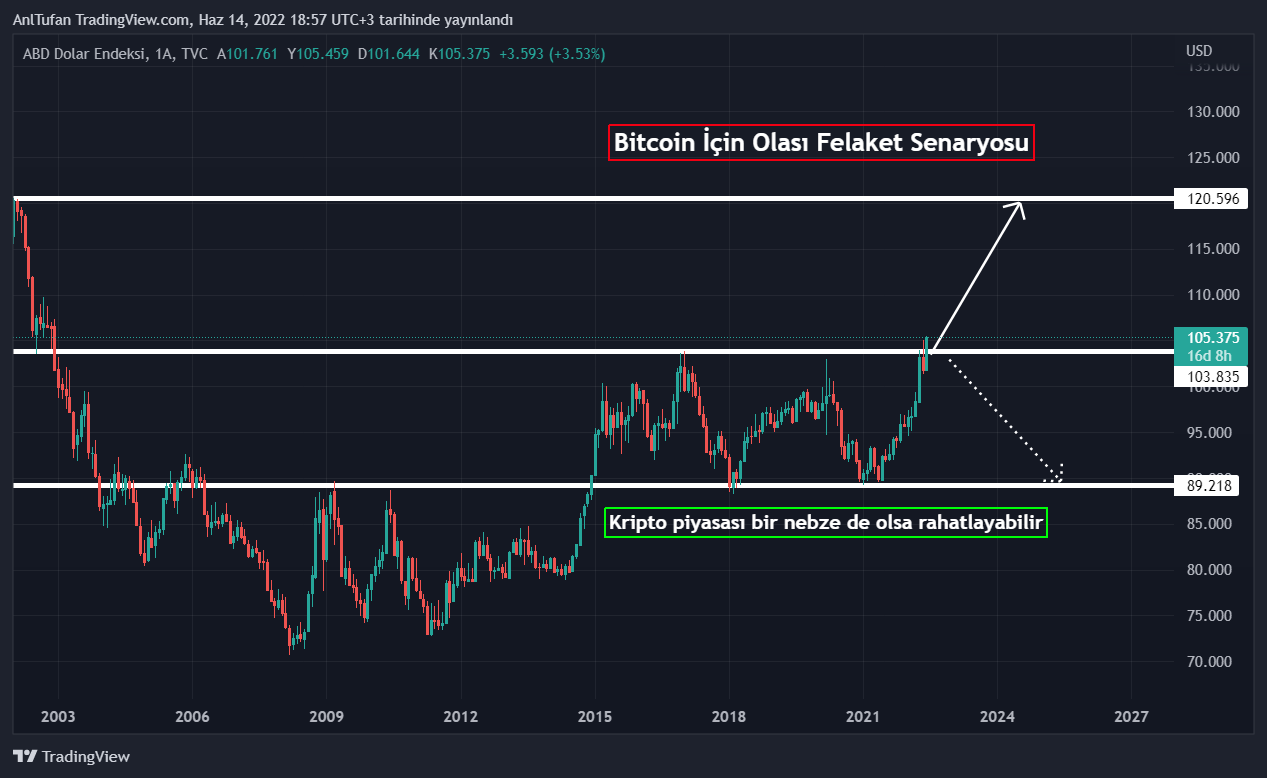 Aylık grafikte an itibariyle kritik bir direnç seviyesi olan 103.85’ün üstünde olan DXY, 2 hafta sonra bu seviye üzerinde bir aylık kapanış yapması halinde, kripto piyasasında bir kaos yaşanmasına sebebiyet verebilir.