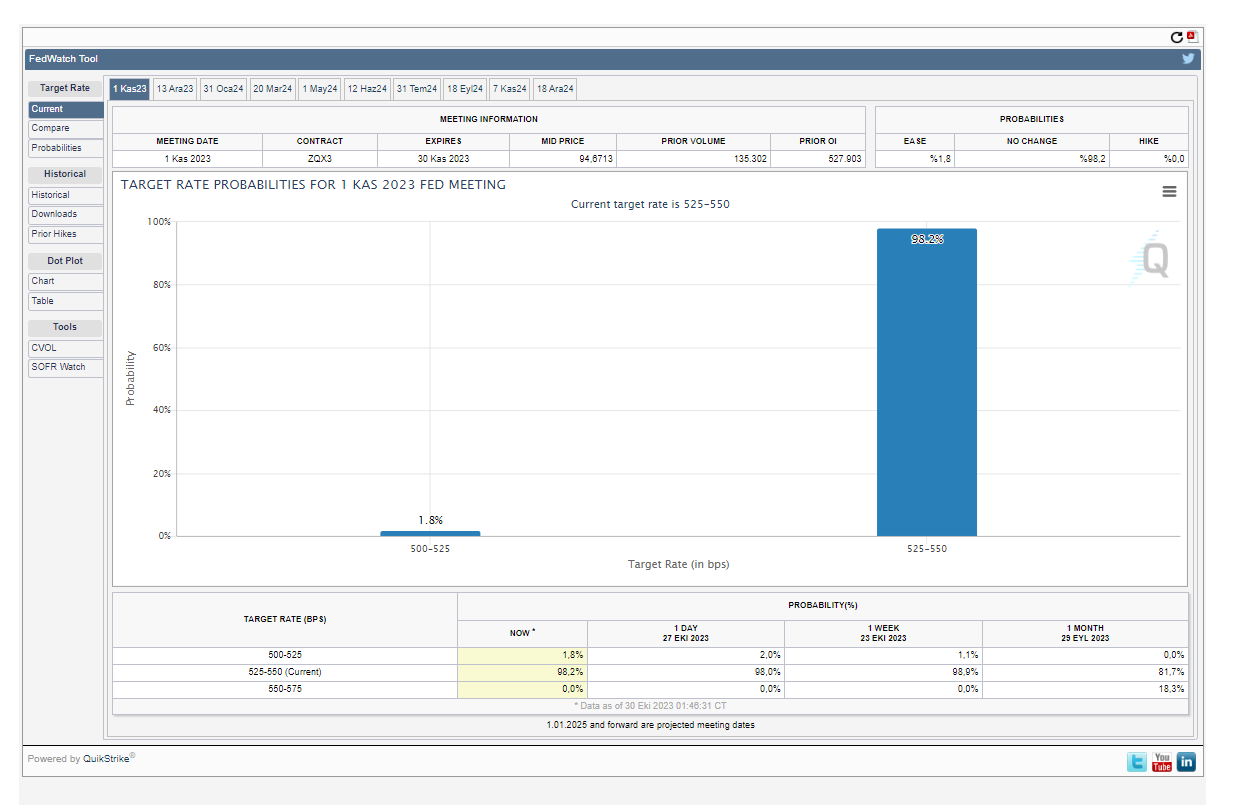 Bu hafta itibariyle 1 Kasım çarşamba günü ABD Merkez Bankası (FED) yeni faiz kararını açıklayacak. Şuan itibariyle CME FEDWatch Tool’a baktığımızda, faizler %98,2 oranında sabit tutulacak.