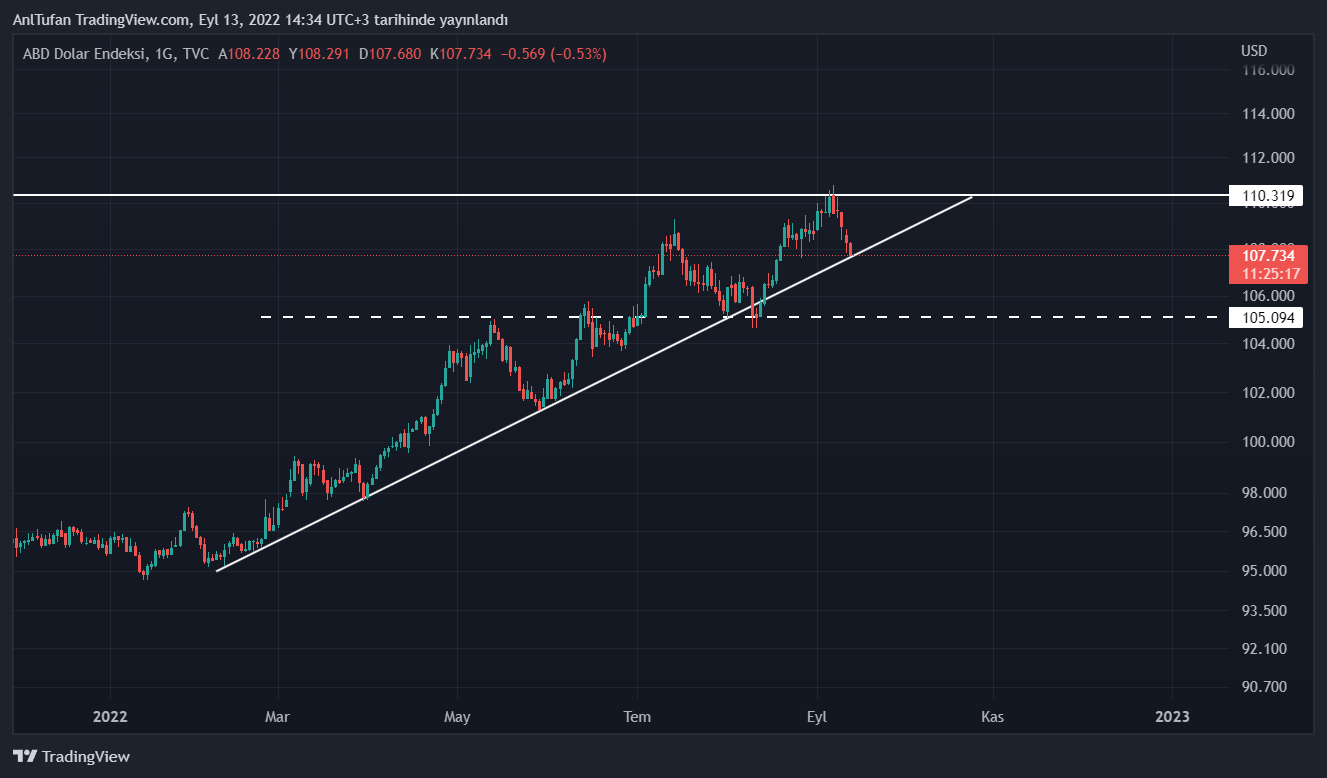 ABD dolar endeksi (DXY) 110 dolar seviyelerinden başlattığı düşüş trendine bugün itibariyle de devam etmekte. 107.70 dolar seviyelerine kadar gerileyen DXY, major yükselen trend noktasına ulaştı.