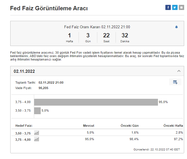2 Kasım itibariyle Amerikan Merkez Bankası (FED) yine faiz artışına gidecek. Bu sefer beklentilerin yüzde 95’i, 75 baz puanlık bir artış olacağı yönünde.