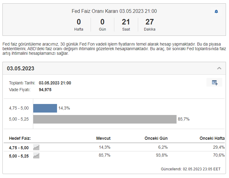 Şuan itibariyle yatırımcılar Amerikan Merkez Bankasının (FED) yarın itibariyle yine faiz oranlarını artırıp artırmayacağını merak ediyor. Son piyasa beklentilerine göre, FED yarın faizleri 25 baz puan artıracak.