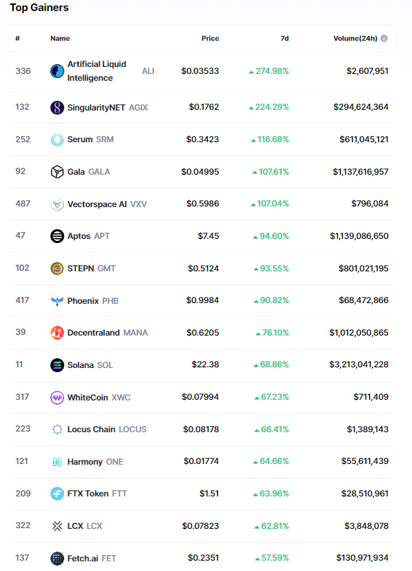 Bir yapay zeka altcoin’i olan ALI, FOMO ile birlikte bu hafta itibariyle yüzde 274 oranında değer kazanmayı başardı. ALI haricinde ise aşağıda yer alan altcoin’lerde çok ciddi patlamalar yaşadı:
