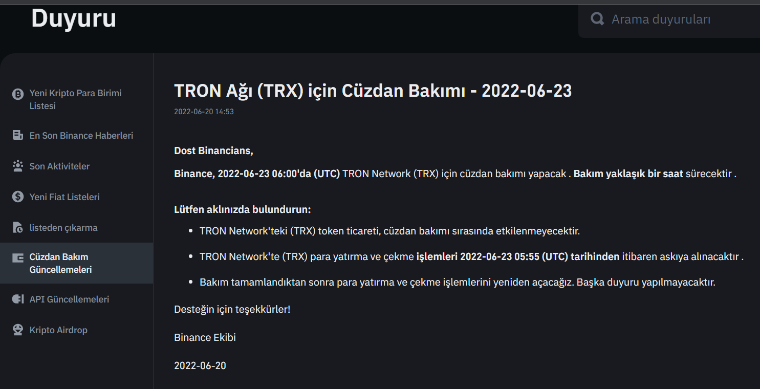 23 Haziran tarihinde TSİ 09.00’dan 10.00’a kadar Tron cüzdanlarında bir bakım operasyonu gerçekleştireceklerini aktaran başarılı borsa, yatırma ve çekim işlemlerinin askıya alınacağını söylüyor.