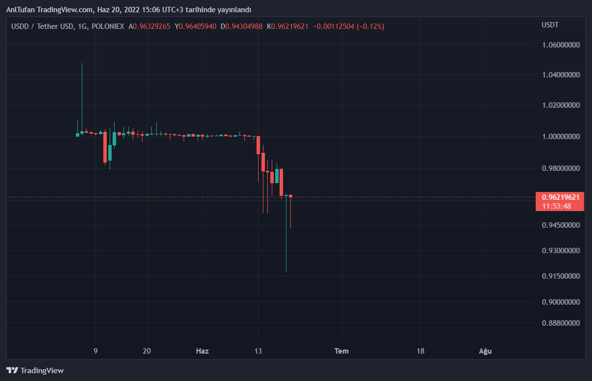 10.000.000 adet USDD satın alan Tron DAO, halen popüler stablecoini tekrardan 1 dolara ulaşmasını sağlayamamış durumda. Geçtiğimiz dakikalarda 0.91 dolara kadar düşüş yaşayan USDD, birçok yatırımcının korkmasına neden oldu.