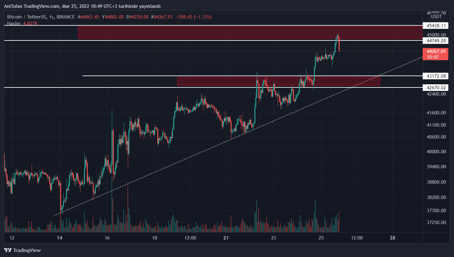 Bugün itibariyle 44.800 – 45.500 dolar direncini tekrar deneyen Bitcoin, yine sert bir satış baskısı ile karşı karşıya kalmış durumda.